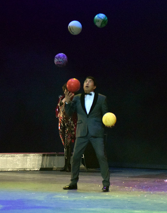 Como todo buen circo, la habilidad física sorprende gratamente al espectador, hay malabares, danza aérea, aros, fuerza capilar, trucos con agua, bule bule, báscula, entre otros múltiples recursos circenses. El espectáculo concluye con un número especial de Angelo, quien hace alarde de sus estudios musicales, al interpretar A mi manera, con seis diferentes instrumentos: clarinete, saxofón, trompeta, trombón, violín, acordeón, para concluir con el instrumento más bello, su voz.